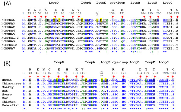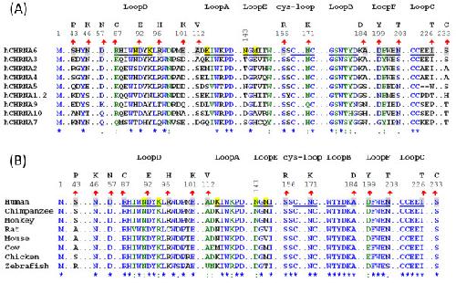 Figure 1. Localizations of N-terminal variations to primary/secondary structure of nAChR hα6 subunits. (A) Degree of conservation of variant residues in nAChR hα6 subunit in relation to other human nAChR α subunits: Human nAChR α subunits (α1-α7, α9 and α10) are aligned using ClustalW. Indicated residues in nAChR hα6 subunits undergoing variation are fully (Asp92 and Ser156), strongly (Arg87 and Asn171) and weakly (Asp57, Asp199 and Asn203) conserved in human nAChR α subunits. Some of the variations in nAChR hα6 subunit are localized to indicated loop regions: Ala112Val (loop A), Ala184Asp (loop B), Ile226Thr (loop C), Asp92Glu (loop D), Asp199Tyr (loop F) and Asn203Thr (loop F) and Asn171Lys (cysteine-loop). (B) Degree of conservation of variant residues in nAChR hα6 subunit in relation to nAChR α6 subunits from other organisms: nAChR α6 protein sequences extracted from (GenBank) NP_067344.2 (Mouse), NP_004189.1 (Human), NP_990695.1 (Chicken), NP_476532.1 (Rat), NP_001029266.1 (Chimpanzee), XP_001099152.1 (Monkey), XP_584902.3 (Cow) and NP_001036149.1 (Zebrafish) are aligned by using ClustalW. For both (A) and (B); numbering begins at translation start methionine of nAChR hα6 subunit and is shown in the regions of interest. However, only segments of the alignment are presented to identify WT nAChR hα6 subunit AA residues (shaded, upward arrow mark and numbers above them) and their corresponding variations (noted above the numberings). Symbols below sequences indicate fully (*), strongly (:) or weakly (.) conserved residues: hα6 subunit AA residues at positions 87 (Arg), 92 (Asp), 156 (Ser) and 171 (Asn) are conserved in both human nAChR α subunits and nAChR α6 subunits of other organisms. Also shown (shaded) are the nAChR hα6 subunit residues including the loop E residue N143 that alone or in combination Met145 influences the function of hα6*-nAChRs [26]. |