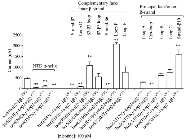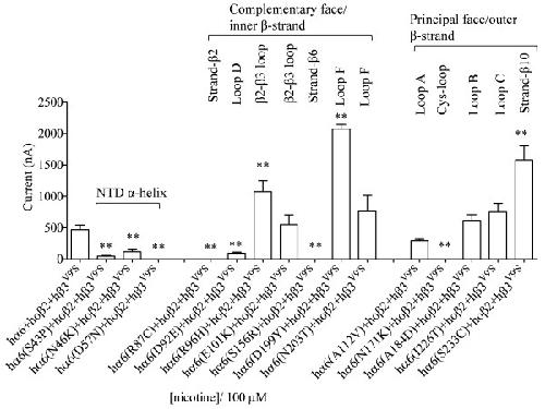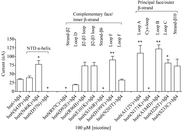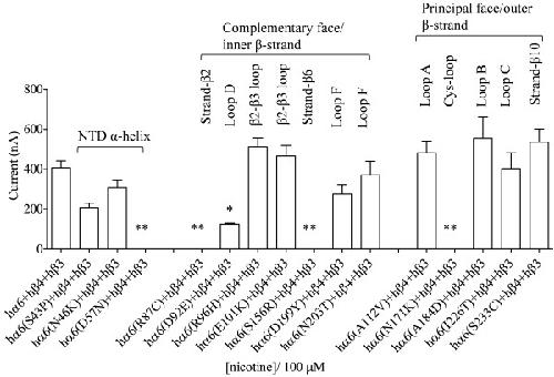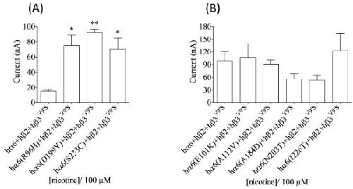 Figure 5. Variations in nAChR hα6 subunit influence the current responses of hα6hβ4-nAChRs. Mean (±SE) peak inward current responses upon exposure to 100 μM nicotine (5 sec exposure; ordinate) are estimated from oocytes (n = 6-9) voltage clamped at −70 mV and heterologously expressing the indicated nAChR subunits. Oocytes coexpressing hα6A184D (variation in loop D) and hβ4 subunits yield largest current responses to 100 μM nicotine. Comparisons of peak current responses between control (hα6hβ4-nAChR) and variant groups were analyzed using one-way ANOVA with Dunnett’s multiple comparisons test (*, p < 0.05; and **, p < 0.01). |