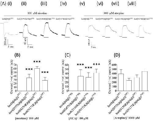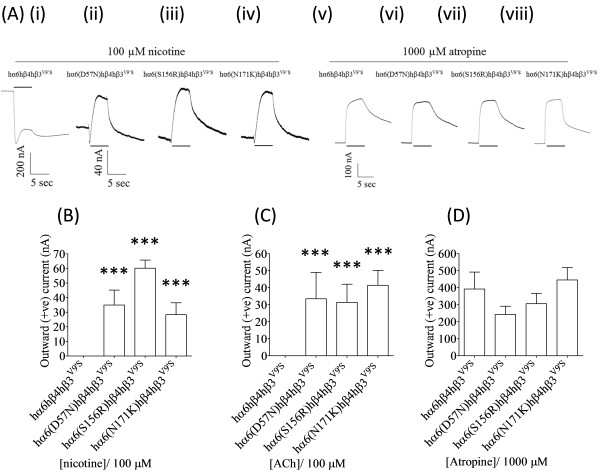 Figure 7. Nicotinic agonists act as antagonists at hα6(D57N, S156R or N171K)hβ4hβ3V9’S-nAChRs. (A) Representative traces are shown for inward or outward current responses from oocytes (voltage clamped at -70 mV) responding to the application of indicated concentrations of nicotine or atropine (shown with the duration of drug exposure as black bars above or below the traces) and expressing hα6hβ4hβ3V9’S- [(A) (i) and (v)], hα6D57Nhβ4hβ3V9’S-[(A) (ii) and (vi)], hα6S156Rhβ4hβ3V9’S[(A) (iii) and (vii)] or hα6N171Khβ4hβ3V9’S- [(A) (iv) and (viii)] nAChRs. Calibration bars are for 200 (i), 40 [(ii), (iii) and (iv)] or 100 [(v), (vi), (vii) and (viii)] nA currents (vertical) or 5 sec (horizontal). Results for these and other studies were used to estimate mean (±SE) peak outward current responses to 100 μM nicotine (B), 100 μM ACh (C) or 1000 μM atropine (D) from oocytes (n=3-6) heterologously expressing the indicated nAChR subunits. hα6(D57N,S156RorN171K)hβ4hβ3V9’S-nAChRs elicit outward (positive) current in response to nicotine (B) or ACh (C) which is completely absent from hα6hβ4hβ3V9’S-nAChRs [(B) and (C)]. hα6(D57N,S156RorN171K)hβ4hβ3V9’S-nAChRs in rare occasion display minuscule inward currents in response to ACh or nicotine (data not shown). Comparisons between groups were analyzed using one-way ANOVA with Tukey’s post hoc comparison and only those differ from the control (hα6hβ4hβ3V9’S-nAChR) are marked with asterisks. ***; p < 0.001. |