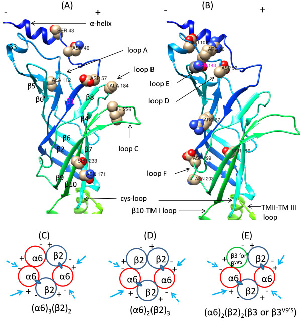 Figure 2. Localizations of AA variations to secondary structures and interfaces of nAChR hα6 subunit. [(A) and (B)] AA residues undergoing variation are identified in a 3D model of the nAChR hα6 subunit: A 3D homology model of the nAChR hα6 subunit was generated based on the crystal structure of Torpedo muscle nAChR α subunit (PDB code: 2BG9:A). Hence structural features are approximate and may deviate from what seen with α subunit of Torpedo muscle nAChR. β strands constitute inner β-sheet (strand β1-β3, β5, β6 and β8) and outer β-sheet (strand β4, β7, β9 and β10); and are connect to each other via loops. These loops constitute positive (+) (loops A, B and C) and negative face (loops D, E and F) of α6 subunit and contribute to subunit assembly, ligand binding, and formation of ligand binding pocket and/or coupling agonist binding to channel gating. Cysteine loop and other loop residues undergone variations are also identified. [(C)-(E)] Interfaces contributed by α6 subunit to formation of α6*-nAChR: Adhering to the canonical rule of pentamer formation, α6β2-nAChR would be formed out of three α6 and two β2 subunits [i.e., (i) (α6)3(β2)2-nAChR] or two α6 and three β2 subunits [i.e., (ii) (α6)2(β2)3-nAChR]. In the event β3 or gain-of-function β3 (i.e., β3V9’S) subunits to be integrated into α6β2*-nAChR complexes these subunits would take the position of 3rd α6 subunit in the 1st (i) configuration or 3rd β2 subunit in the 2nd (ii) configuration [i.e., (iii) (α6)2(β2)2(β3or β3V9’S)-nAChR]. Similarly, β4 subunit would substitute β2 subunit for formation human α6β4-[i.e., (α6)3(β4)2 and (α6)2(β4)3]-nAChR. For formation of (α6)2(β4)2β3- or (α6)2(β4)2β3V9’S-nAChR β3 or β3V9’S subunits would substitute one α6 subunit in (α6)3(β4)2 configuration or one β4 subunit in (α6)2(β4)3 configuration. Two presumed agonist (ACh or nicotine and others) binding sites in the interface of α6(+) and β2(−) subunits are identified as ovals. Variations in the structural loops in the (−)-ve face (loop D, E and F) and (+)-ve face (loop A, B and C) of the hα6 subunit are expected to affect the function of hα6*-nAChRs involving interfaces identified by arrow marks. |