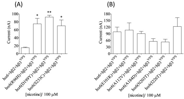 Figure 3. Variations in nAChR hα6 subunit influence the current responses of human α6β2β3V9’S-nAChRs expressed in oocytes using codon optimized nAChR hβ2 subunits. Mean (±SEM) peak inward current responses upon exposure to 100 μM nicotine (5 sec exposure; ordinate) are estimated from oocytes (n = 3-7) voltage clamped at −70 mV and heterologously expressing the indicated nAChR subunits. Current responses of hα6hβ2hβ3V9’S-nAChR are completely abolished (D57N or S156R), partially abolished (S43P, N46K, R87C, D92E or N171K), not changed (E101K, A112V, A184D, N203T or I226T) and increased (R96H, D199Y or S233C) as a result of the indicated variations in nAChR hα6 subunits. Oocytes coexpressing nAChR hα6(D199Y) subunits, codon optimized hβ2 subunits and hβ3V9’S subunits yield largest current responses to nicotine. Comparisons of peak current responses between control (hα6hβ2hβ3V9’S-nAChR) and variant nAChR groups were analyzed using one-way ANOVA with Dunnett’s multiple comparisons test (*, p < 0.05; and **, p < 0.01). |
