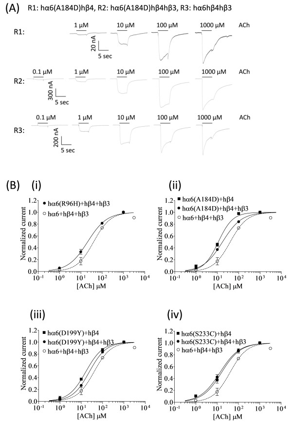 Figure 8. Variations in nAChR hα6 subunit influence the ACh sensitivity of hα6hβ4*-nAChRs. (A) Representative traces are shown for current responses from oocytes (voltage clamped at −70 mV) responding to the application of indicated concentrations of ACh (shown with the duration of drug exposure as black bars above the traces) and expressing indicated nAChR (i.e., R1: hα6A184Dhβ4-nAChR, R2: hα6A184Dhβ4hβ3-nAChR, R3: hα6hβ4hβ3-nAChR]. (B) Results averaged across experiments were used to produce concentration-response (CR) curves (ordinate-mean normalized current ± SEM; abscissa - ligand concentration in log μM) for inward current responses to ACh as indicated for the nAChR expressed in oocytes and voltage clamped at −70 mV. Current amplitudes are represented as a fraction of the peak inward current amplitude in response to the most efficacious concentration of ACh. Leftward shifts in ACh CR curves for hα6R96Hhβ4hβ3-(●) [(B) (i)], hα6A184Dhβ4hβ3-(●) [(B) (ii)], hα6D199Yhβ4hβ3-(●) [(B) (iii)], or hα6S233Chβ4hβ3-(●) [(B) (iv)] nAChR are evident relative to that of hα6hβ4hβ3-nAChR (○). Furthermore ACh curves for hα6A184Dhβ4-(■) [(B) (ii)], hα6D199Yhβ4-(■) [(B) (iii)], or hα6S233Chβ4-(■) [(B) (iv)] nAChR are shifted leftward relative to those nAChR containing the same subunits but in the additional presence of hβ3 subunits. See Table 3 for parameters of ACh action. |