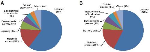 Fig. 2. Gene ontology (GO) of genes showing dysregulation in ext1 morphants. We characterized genes that showed a change of greater than two fold (A) or less than 0.5 fold (B) in ext1 morphant embryos. More than half of the genes up-regulated in response to ext1 knockdown had unknown functions. Among those with known functions, 16% were associated with metabolic processes, including transcriptional and translational regulation. Signaling-associated genes accounted for 6%, while 5% were involved in developmental processes. The remainder included establishment of localization (4%), cellular processes (3-4%), and others (6%). The âothersâ category includes multicellular organismal processes, response to stimulus, cell proliferation, cellular component organization, and reproductive processes. Similar proportions were observed for genes that were down-regulated following a reduction in Ext1 expression.