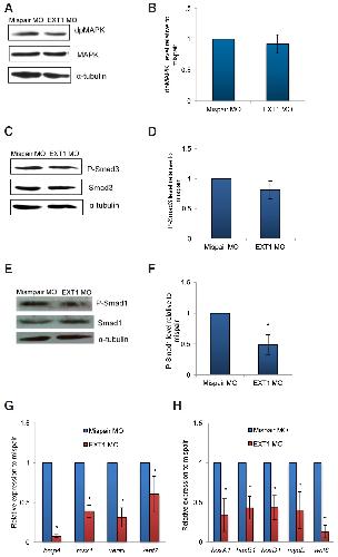 Fig. 4. The effects of Ext1 knockdown on paracrine signaling pathways. Embryos were injected with EXT1 or mispair MO and lysed at stage 10.5. (A,C,E) Immunoblots showed levels of diphospho- ErkMAPK (dpMAPK), phospho-Smad3, and phospho-Smad1 in EXT1 or mispair MO-injected embryos. (B,D,F) Relative levels of phosphorylated forms of MAPK, Smad3, and Smad1 in EXT1 or mispair MO-injected embryos. Phospho-Smad1 is reduced in EXT1 morphant embryos, whereas levels of dpMAPK and phopho-Smad3 are unchanged. (G) Q-RT-PCR assays of BMP4 and the BMP4 target genes msx1, vent1, and vent2 in control or ext1 morphant embryos. (H) Q-RT-PCR assays of wnt8 and the wnt8 target genes HoxA1, HoxB1, HoxD1, and myoD. The relative -fold change of each target gene in EXT1 MO-injected embryos was calculated as described in Fig. 3. (B,D,F-H) Bars represent mean ± S.D. N=3 independent experiments. *: p < 0.05.