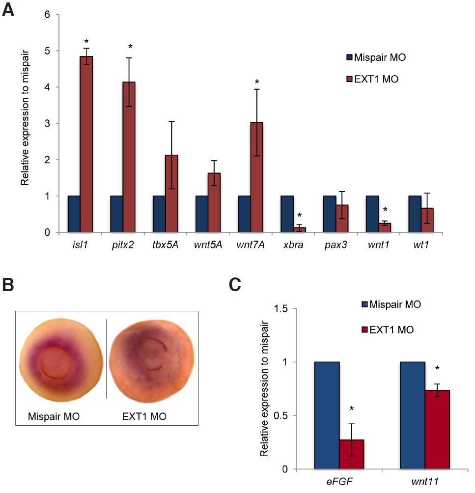 3. Validation of xbra and other genes affected by ext1 knockdown. (A) Selected genes identified by microarray were validated using Q-RT-PCR. Embryos injected with 20 ng of EXT1 MO or EXT1 MIS were collected at stage 10.5 for RNA extraction and Q-RT-PCR. (B) In situ hybridization shows differences in xbra expression in control vs ext1 morphant embryos. Results are representative of over 2/3 of embryos from 3 independent experiments. (C) Q-RT-PCR assays for expression of the xbra target genes eFGF and Wnt11. Relative fold enrichment of each target gene was calculated after normalization with the housekeeping gene ornithine decarboxylase (ODC) using the δδCt method. Bars represent mean ± S.D. N=3 independent experiments. *: p < 0.05.