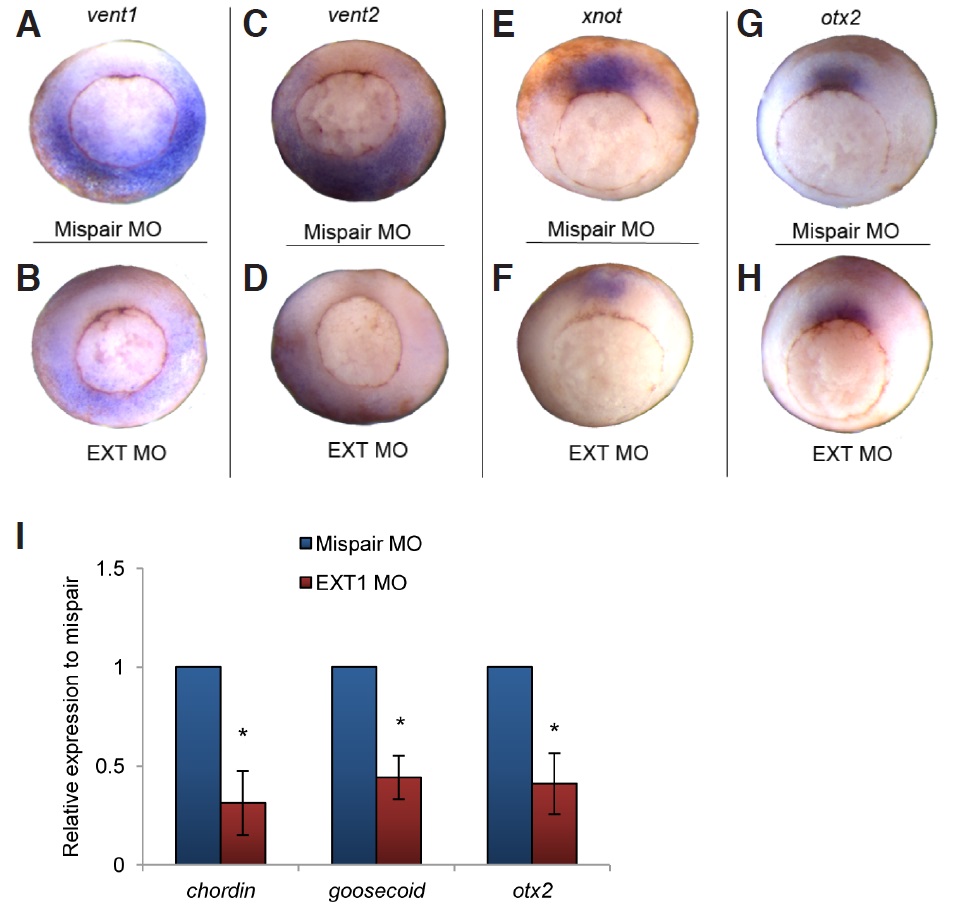 Fig. 5. Establishment of dorsal- or ventral-specific patterns of gene expression in ext1 morphant embryos. Embryos were injected with 20 ng of EXT1 or mispair MO. In situ hybridization of vent1 (A,B); vent2 (C,D); not1 (E,F); and otx2 (G,H). Expression patterns shown are representative of at least 2/3 of embryos from 3 independent experiments. (I) Q-RT-PCR assays of organizer-specific gene expression in ext1 MO or mispair MO embryos. Relative âfold changes were evaluated as described in Fig. 3. Bars represent mean ± S.D. N=3 independent experiments. *: p < 0.05.