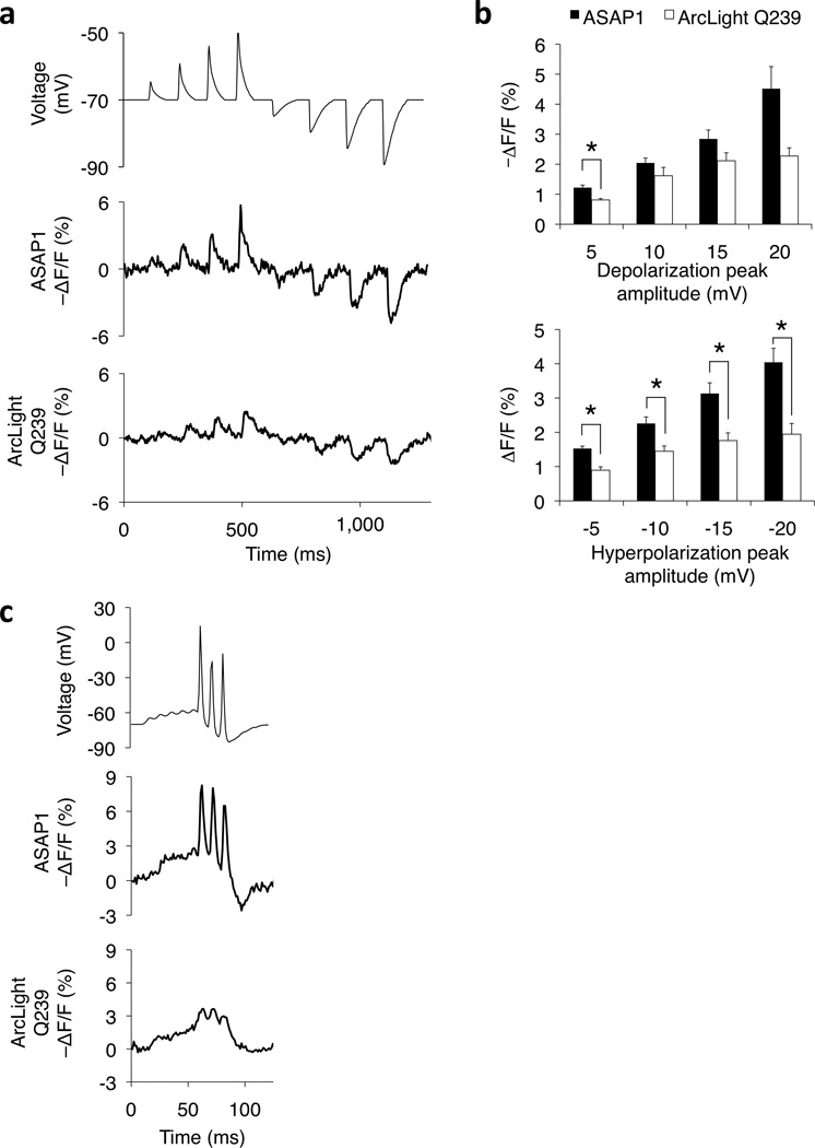 Accurate optical reporting of electrical activity in genetically defined neuronal populations is a long-standing goal in neuroscience. We developed Accelerated Sensor of Action Potentials 1 (ASAP1), a voltage sensor design in which a circularly permuted green fluorescent protein is inserted in an extracellular loop of a voltage-sensing domain, rendering fluorescence responsive to membrane potential. ASAP1 demonstrated on and off kinetics of ∼ 2 ms, reliably detected single action potentials and subthreshold potential changes, and tracked trains of action potential waveforms up to 200 Hz in single trials. With a favorable combination of brightness, dynamic range and speed, ASAP1 enables continuous monitoring of membrane potential in neurons at kilohertz frame rates using standard epifluorescence microscopy.