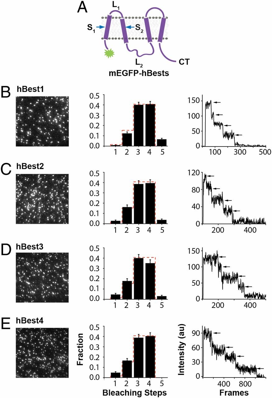 Single-molecule subunit counting on the four members of the bestrophin family. (A) hBest cartoon here and elsewhere based on Milenkovic topology model. (B–E) Single-molecule irreversible photobleaching to count number of mEGFPs per fluorescent spot (i.e., number of subunits per channel) in hBest1 (B), hBest2 (C), hBest3 (D), and hBest4 (E). (Left) Images show first frame of the movie to indicate density of spots. (Middle) Average frequency distributions of number of bleaching steps (black bars) with error bars indicating SEM. Dashed red line indicates theoretical binominal distribution for tetramer with probability that mEGFP is fluorescent = 0.80. (Right) Fluorescence traces from single spots showing four steps of photobleaching. |