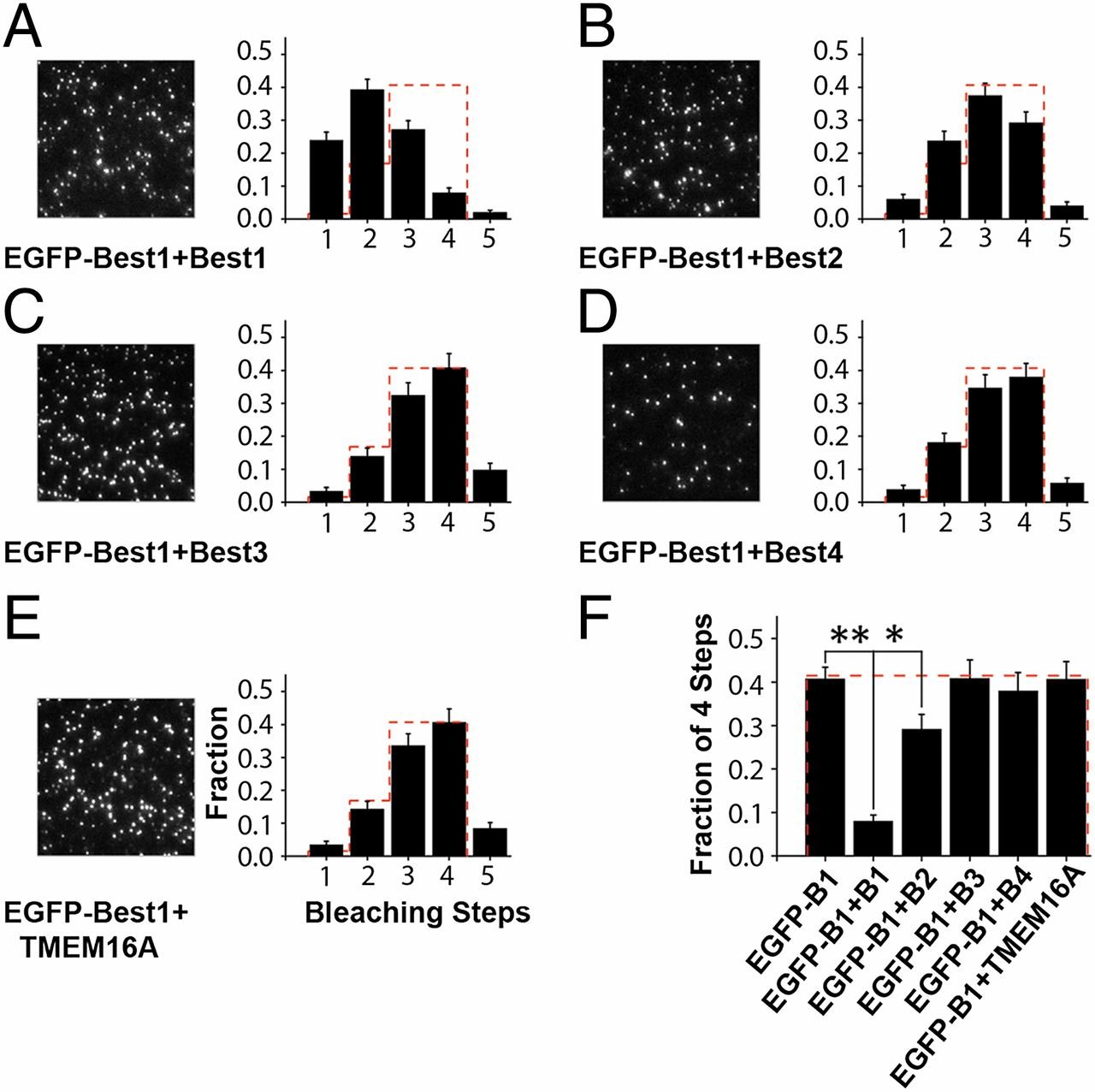 bleaching steps (black bars). Error bars indicate SEM. Dashed red line indicates theoretical binominal distribution for tetramer with probability that EGFP is