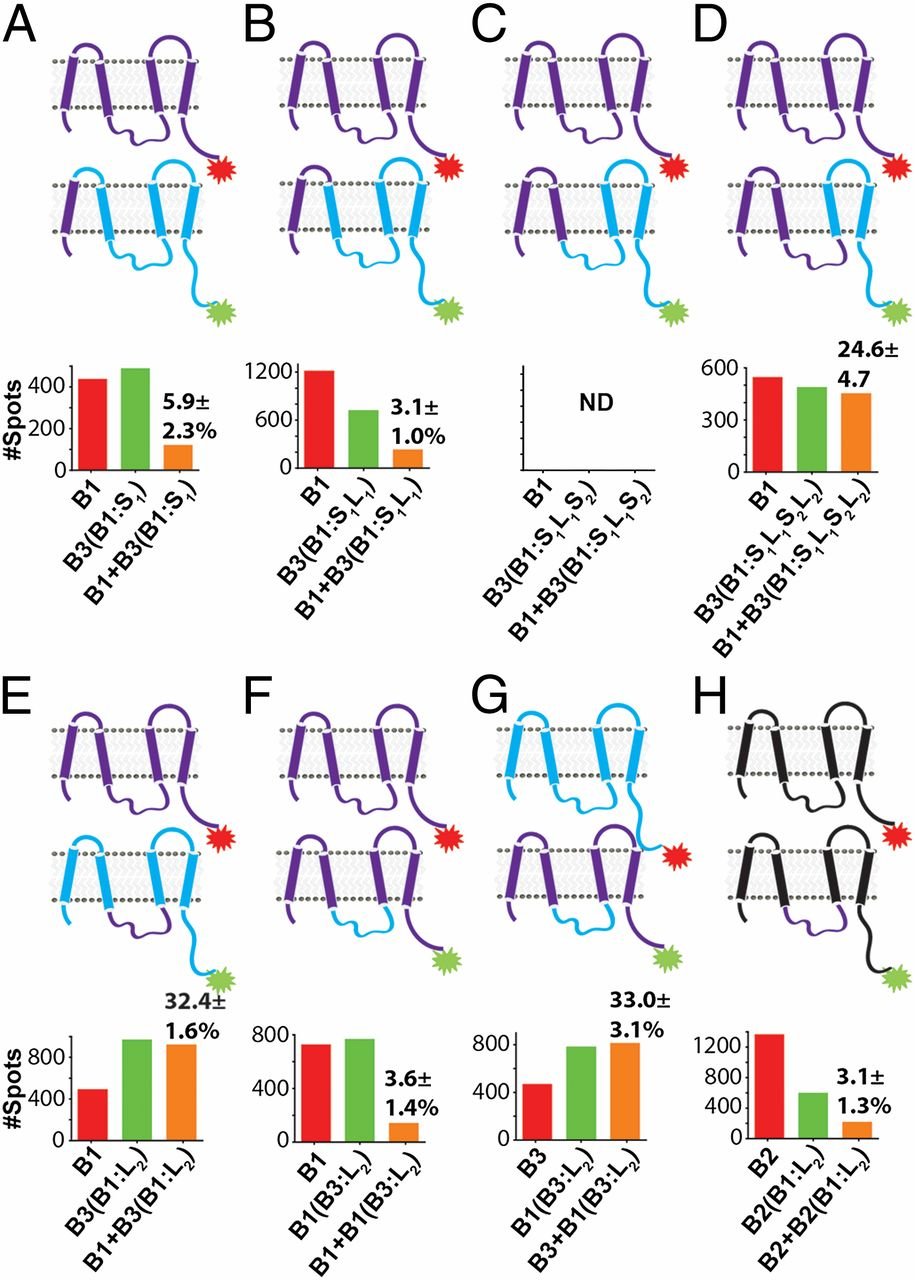Single-molecule colocalization identifies coiled-coil domain in L2 as assembly determinant. (A) Protein sequence alignment of L2 domains of hBest1 and hBest3 shows high conservation (gray highlights), except in Var and also identifies CC. (B and C) Colocalization of B1 with B3 containing only the Var of B1 (B) or with B3 containing only the CC of B1 (C). (D) Comparison of colocalization results obtained in Figs. 2, 4, and 5. |