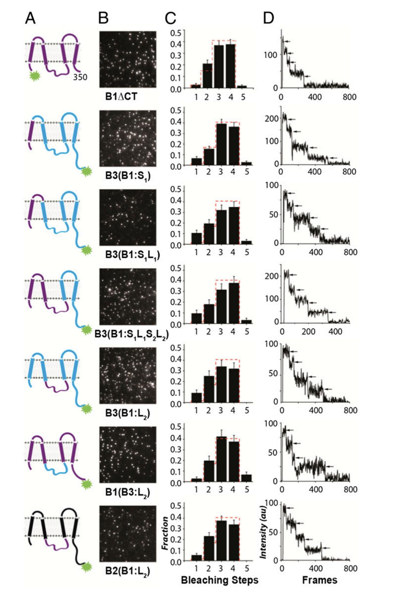 density of spots. (C) Average frequency distribution of the number of bleaching steps (black bars) per fluorescent spot (error bars indicate SEM). Dashed red