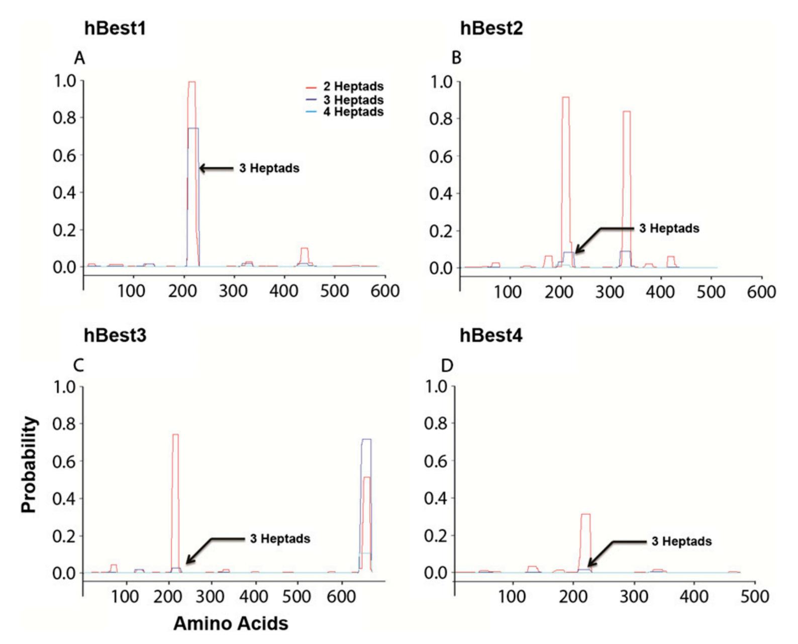Fig. S6. Coiled-coil domains predicted by Coils software in each member of the hBest family. (A–D) Probability of hBests having coiled-coil domains at different positions in the protein. Red, navy blue, and light blue solid lines show the probability of two, three, and four heptads, respectively. Note that there are