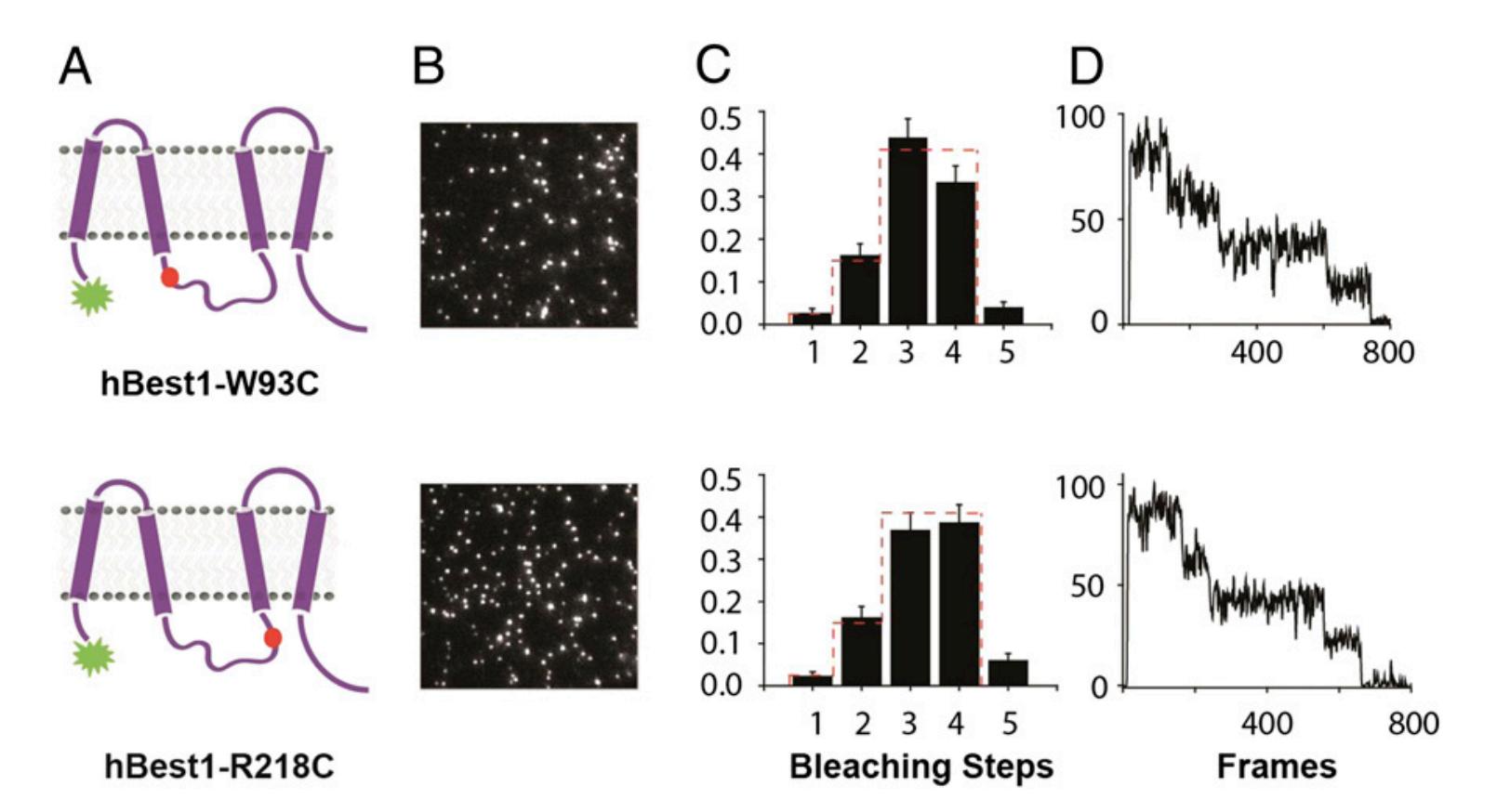 Fig. S7. Single-molecule subunit counting on (A) hBest1:W93C and (B) hBest:R218C. (A) Cartoons of the mutants based on Milenokovic topology model. Red