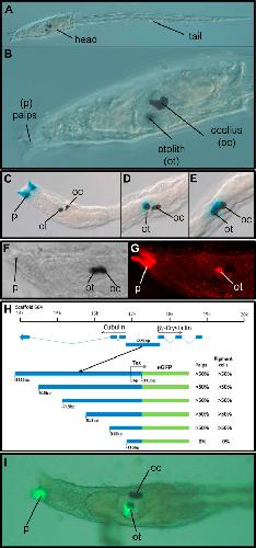 Fig. 1. (A) Ciona tadpolelarva, with anterior to the left. The distinction between head (sometimes described as the trunk) and tail is shown. (B) A magnified view of the head, including the sensory vesicle in which the ocellus (oc) and otolith (ot) pigment cells lie, and the palps (p) at the anterior. (C)â(E)Ciona larvae electroporated with Ci-βγcrys pCES. A shows reporter expression in the palps. B shows reporter expression in the otolith. In C, expression includes the otolith but extends more towards the ocellus as described previously (Shimeld et al., 2005). (F, G) Localisation of Ci-βγcrys protein detected by immunohistochemistry. D shows a larval head imaged by DIC microscopy, and E a fluorescent image of the same larva with protein localised in palps and otolith. (H) Initial deletion analysis of the 1225 bp Ci-βγcrys 5â² regulatory region. At the top is the location of this region on scaffold 604 of the version 1C. intestinalis genome assembly (Dehal et al., 2002), between the divergently transcribed cubulin and Ci-βγcrys genes. Schematics of successive 200 bp deletions are underneath. Constructs showed transgene expression in palps and pigment cells in at least 50% of embryos (>50%), or no transgene expression was detected in these tissues in any embryo (0%). Each construct was tested in at least 2 independent electroporations, including concurrent positive and negative controls, with positive control transgenesis levels of at least 50% and with at least thirty surviving embryos per construct. TSS indicates the transcription start site, and numbering is from this point. (I) A transgenic larva with fluorescent reporter detected in palp and otolith. Only one palp is labelled, a common occurrence reflecting mosaicism.