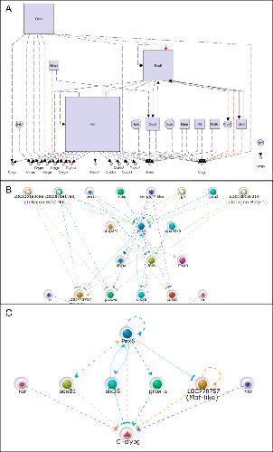 Fig. 3. (A) The complete vertebrate mouse lens network as illustrated by myGRN. Developmental time flows from top left (7.5 dpc) to bottom right. The outermost layer of the network includes all those interactions that cannot be placed in a specific tissue or time point. Importantly genes appear only once within the network and so interactions that feed forward or back can be clearly seen. Dashed lines indicate interactions for which the existence of intermediates cannot be formally excluded. The circular symbols represent the type of gene: solid circles are transcription factors, solid asterisks are signals, inverted asterisks represent receptors and triangles illustrate terminal markers. This network is available in a fully interactive format at http://public.networks.mygrn.org/. An animated version of this network is provided as Supplementary movie 1. (B, C) Here the complete network is visualised with genes sized according to centrality within the network. Genes with more connections are larger. When including the crystallins, Pax6 and Maf emerge as key regulators (B). However, if the crystallins are excluded from the network, the relative importance of Maf is decreased and Foxe3 appears more important (C).