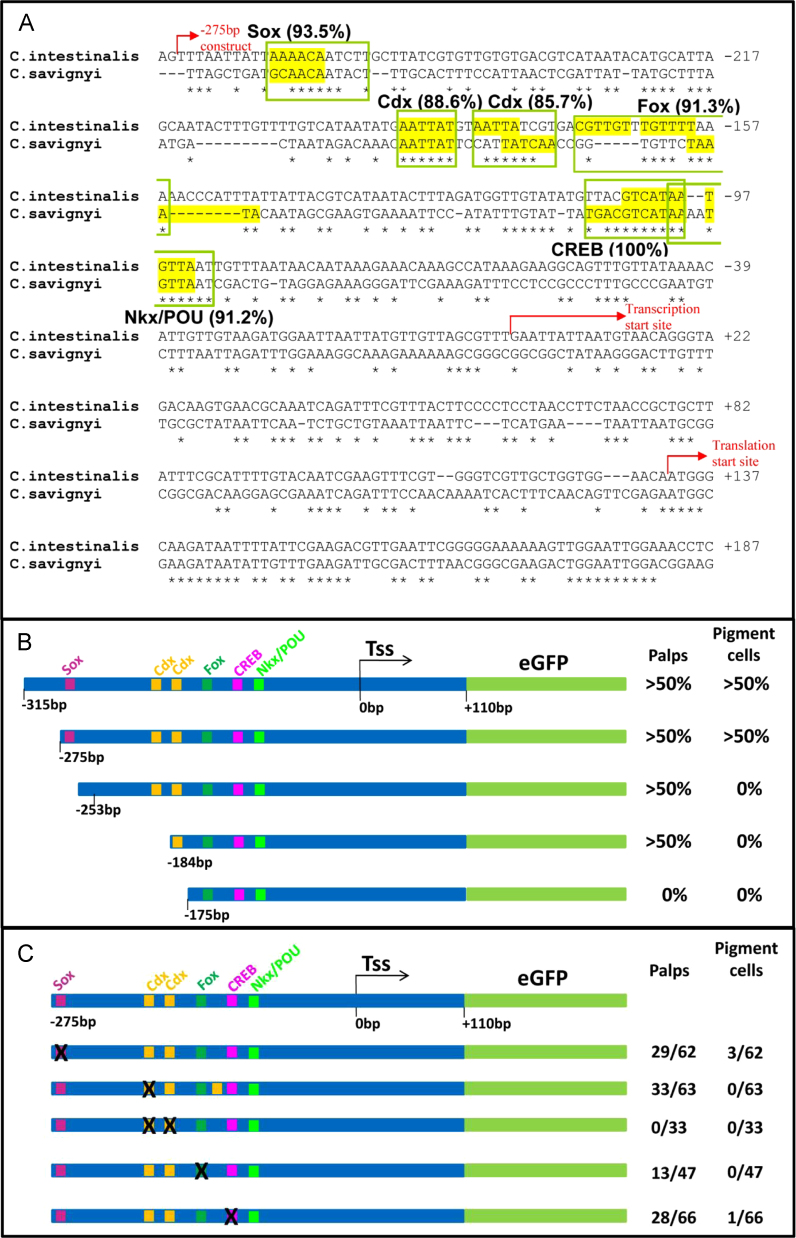Fig. 2. (A) Alignment of the orthologous Ci-βγcrys regulatory region from C. intestinalis and C. savignyi, with putative conserved binding motifs boxed. The names of these reflect the database entry (JASPAR or TRANSFAC) to which they match and do not necessarily mean that the specific factor binds this site in Ciona. Highest scores for each site are shown with all sites scoring >70%. Core sequences are highlighted in yellow. The translation start site is shown, as is the presumed transcription start site inferred from the 5′ extreme of cDNA sequence. Numbering starts from this point and refers to the C. intestinalis sequence. The start of the minimal −275 bp construct sequence is shown. (B, C) Fine scale deletion and mutation analysis of the Ciona βγ-crystallin minimal region defined as in Fig. 1. Presumptive binding motifs are represented as coloured boxes. (B) Successive approximately 20 bp deletions, each tested by electroporation. Only constructs spanning changes in reporter activity are shown. Controls and use of percentage signs are as in Fig. 1. (C) Result of mutagenesis of selected motifs (indicated by a cross). We targeted four motifs, chosen due to potential overlap with the vertebrate lens gene regulatory network (Sox, Fox and CREB) and/or because the deletion experiments indicated a function for the region in which they lay (Sox and Cdx). Results were more variable than for deletions; hence we show the number of reporter-expressing larvae alongside the total number of larvae that developed. Typical transgenesis rates in positive controls were around 50%.