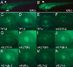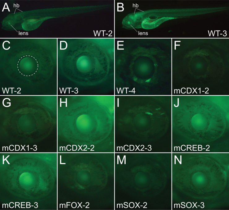 Fig. 5. GFP in zebrafish lens driven by the Ci-βγcry −275 bp construct (designated WT) and mutant binding site constructs. (A, B) Wild-type (WT) −275 bp constructs in two lines showing the whole fish. The lens is shown, as is the hindbrain (hb). (C, E) Wild-type (WT) −275 bp constructs in three separate lines, showing just the eye with the lens circled in C as a reference. (F)–(N) Lines with constructs with mutant (m) binding motifs as in Fig. 2C; mCDX1 (first Cdx motif mutated, 2 lines). mCDX2 (both Cdx motifs mutated, 2 lines). mCREB (CREB motif mutated, 2 lines). mFOX (Fox motif mutated, 1 line). mSOX (Sox motif mutated, 2 lines).