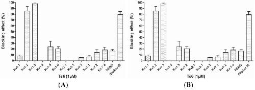 In Brazil, Tityus serrulatus (Ts) is the species responsible for most of the scorpion related accidents. Among the Ts toxins, the neurotoxins with action on potassium channels (α-KTx) present high interest, due to their effect in the envenoming process and the ion channel specificity they display. The α-KTx toxins family is the most relevant because its toxins can be used as therapeutic tools for specific target cells. The improved isolation method provided toxins with high resolution, obtaining pure Ts6 and Ts7 in two chromatographic steps. The effects of Ts6 and Ts7 toxins were evaluated in 14 different types of potassium channels using the voltage-clamp technique with two-microelectrodes. Ts6 toxin shows high affinity for Kv1.2, Kv1.3 and Shaker IR, blocking these channels in low concentrations. Moreover, Ts6 blocks the Kv1.3 channel in picomolar concentrations with an IC50 of 0.55 nM and therefore could be of valuable assistance to further designing immunosuppressive therapeutics. Ts7 toxin blocks multiple subtypes channels, showing low selectivity among the channels analyzed. This work also stands out in its attempt to elucidate the residues important for interacting with each channel and, in the near future, to model a desired drug.