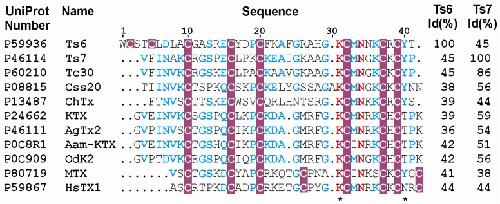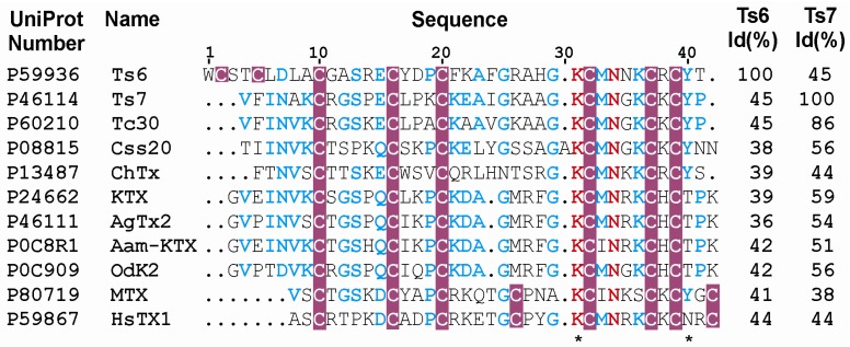 Dauplais, On the convergent evolution of animal toxins. Conservation of a diad of functional residues in potassium channel-blocking toxins with unrelated structures. 1997, Pubmed