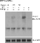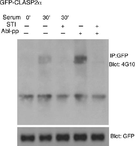 Fig. 1. CLASP2 is tyrosine-phosphorylated by Abl kinase. GFP-CLASP2α was immunoprecipitated from transfected HEK293T cells following starvation and serum treatment for 30 min in the presence or absence of STI-571 (1 µM), a specific Abl inhibitor. Abl-PP is a constitutively active Abl kinase and was co-transfected with GFP-CLASP2α as indicated. Tyrosine phosphorylation of CLASP2α was identified by anti-phosphotyrosine antibody 4G10. The lower band visible in the 4G10 blot is the IgG heavy chain. Re-blotting for GFP shows an equal amount of GFP-CLASP2α immunoprecipitated in each lane. |