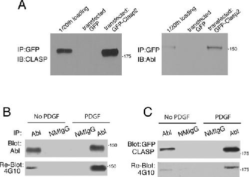 Fig. 2. CLASP2 phosphorylation and interaction with Abl are enhanced by PDGF treatment. A: CLASP2α is associated with endogenous Abl. Lysates from HEK293T cells transfected with either GFP-CLASP2α or GFP (as indicated above lanes) were immunoprecipitated with anti-GFP antibody, probed with anti-CLASP2 (a gift from Anna Akhmanova left panel), stripped and reprobed with anti-Abl antibody (right panel). 1/20th of lysates from cells transfected with GFP-CLASP2α were loaded as controls. B: Increased phosphorylation of Abl after PDGF stimulation. Abl was immunoprecipitated from GFP-CLASP2α transfected 293T cells, which were serum starved and subsequently treated with PDGF for 5 min. A similar level of Abl was immunoprecipitated with and without stimulation (upper panel anti-Abl) while its phosphorylation was increased significantly after PDGF treatment as revealed by anti-phosphotyrosine antibody 4G10 (lower panel). C: PDGF increases association between Abl and CLASP2. Upper panel shows CLASP2 immunoprecipitated by Abl antibody. Lower panel shows phosphorylated CLASP2 by 4G10. GFP transfection alone does not change 4G10 signal (data not shown). |