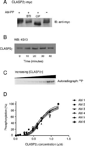 Fig. 3. Phosphorylation of CLASP2γ by Abl in cells and in vitro. A: CLASP2γ is phosphorylated by Abl-PP in Cos-7 cells. Co-expression of the constitutive active Abl-PP reduces the mobility of CLASP2γ-myc in SDS-electrophoresis. This mobility is slightly enhanced by treatment of cells with STI-571. Treatment of cell lysates with CIP enhances the mobility in SDS-gels even further, suggesting CIP further de-phosphorylate CLASP2γ. B: In vitro phosphorylation of CLASP (25 nM) by purified Abl (10 nM) was assayed by 4G10 signal. Both recombinant proteins were produced and purified using a baculoviral expression system. C: Increasing concentrations of purified His-CLASP2γ were incubated with 10 nM recombinant Abl in the presence of γ-p32ATP. D: Quantification of concentration dependence by normalized pixel intensity shows a sigmoidal relationship between substrate concentration and phosphorylation. Data from six independent experiments are shown. Data were fit to the Hill equation with R2 = 0.96. |