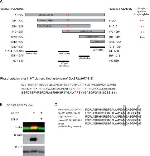 Fig. 4. Identification of CLASP2 tyrosine phosphorylation sites. A: Schematic representation of human CLASP2 constructs and levels of tyrosine phosphorylation. Several N-terminal and C-terminal truncations of CLASP2γ fused to EGFP were tested for in vitro phosphorylation in Cos-7 cells (see B) and the region between the SacI and BamHI restriction sites was identified to be necessary for efficient phosphorylation. This contains the domain necessary for plus end binding (CLASP2-M, [Mimori-Kiyosue et al., 2005]) which was also shown to bind actin [Tsvetkov et al., 2007]. Within this domain the phospho-tyrosines identified by mass spec analysis of full length CLASPα, after serum induction Y800 and Y807, are highlighted in red. Significant phosphorylation of serine 790 or threonine 791 (shown in green) was also observed. The tyrosines identified in mass spec are downstream of two cassettes of GSK-phosphorylation sites (here shown in blue [Kumar et al., 2009]). B: GFP-CLASP fusions were expressed in Cos-7 cells together with Abl-PP and analyzed after IP for tyrosine phosphorylation levels by 4G10 antibody. The results for several truncations of CLASP2 are summarized in A. C: The region containing phosphotyrosines Y800 and Y807 is conserved across many mammalian CLASP2 isoforms and the individual sequences are shown here. Also shown is the predicted region for mouse CLASP2β. Total RNA was harvested from a variety of embryonic mouse tissues, reverse transcribed, and PCR performed for CLASP2. In all neuronal tissues tested (brain, spinal cord, dorsal root ganglion), sequencing of the amplified region identified both a short and long isoform that differed in this phosphotyrosine containing region (data not shown). |