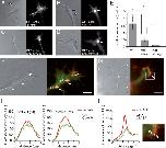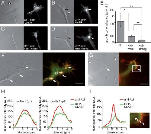 Fig. 8. Actin accumulates in Abl-induced adhesion plaques. A–D: Differential interference contrast (left side) and wide field fluorescence of GFP-actin of live growth cones which express GFP-actin only (A), GFP-actin co-expressed with constitutive active Abl (Abl-PP; B) or GFP-actin with Xenopus Abl (Xabl; C and D). The presence of Abl-induced adhesive plaques is indicated in bright field images (black arrows) and accumulation of GFP-actin (B, D) with white arrows. E: Quantification of growth cone advance in ctl, and Xabl growth cones which show adhesive plaques (as in D; Xabl strong), or weak actin accumulation (as in C; Xabl weak). Error bars represent standard error of the mean (*P < 0.025, **P < 0.01.) F–G: Immunolocalization of Abl (red) in growth cones expressing GFP-CLASP2γ (green) and Abl-PP with corresponding bright field images. Abl induced structures (white arrows) appear as round adhesive plaques (F) or as half circular fronts of Abl and CLASP2 accumulation (G, insert in I). H,I: Fluorescence intensity distribution of Abl and CLASP2 evaluated by intensity profiles (10 pixel integration). H: Intensity profiles shown in F as p1, p2. I: Profile across the ridge of the circular structure in G (region and direction of profile shown as arrow in insert). Scale bars are 10 μm. |