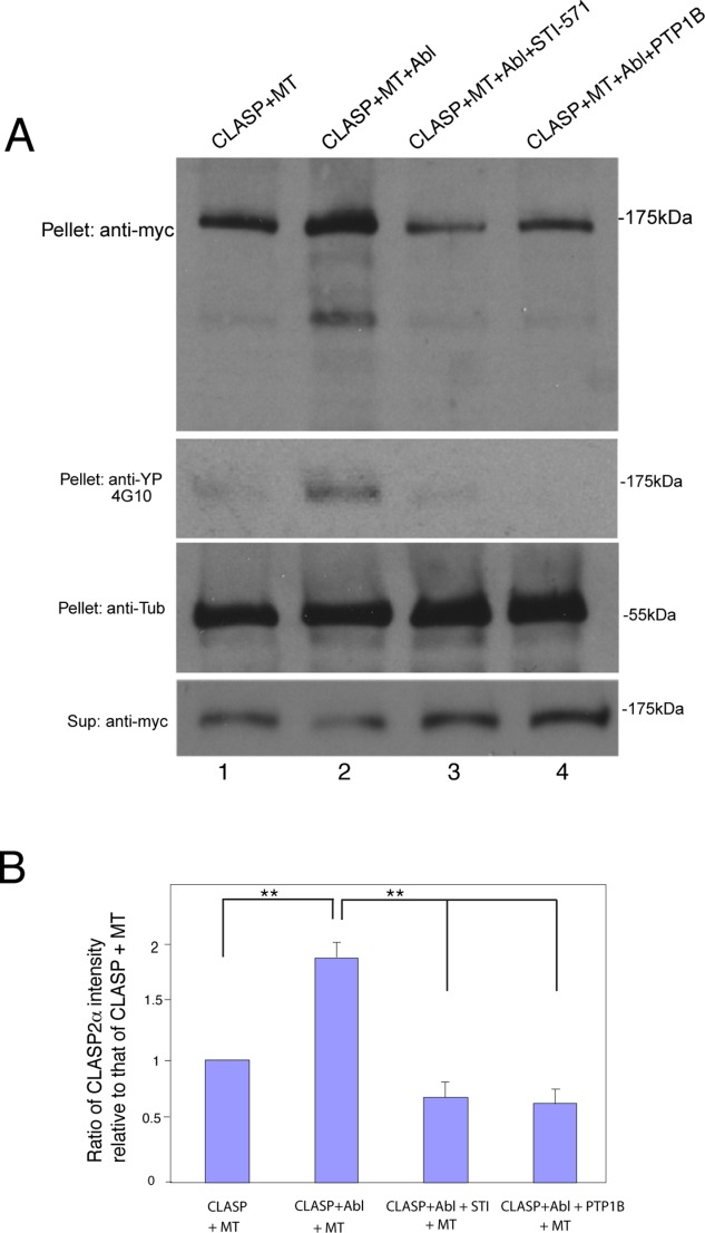 Fig. 5. Modulation of CLASP2α binding to MTs by Abl kinase. Purified CLASP2α-myc-His was incubated with taxol-stabilized MT bundles (see Materials and Methods) for 30 min with the components indicated above the lanes. The mixture was centrifuged and the pellet was collected and analyzed by Western blot using an antibody directed against myc to detect CLASP2α. Blots were re-probed with the anti-phosphotyrosine antibody 4G10 and anti-tubulin (anti-tub). Increased amounts of CLASP2α were pelleted with stabilized MTs in the presence of Abl (Lane 2) compared to the absence of Abl (Lane 1), STI-571 treatment (Lane 3), or protein tyrosine phosphatase 1B (PTP1B) (1 µg/µl) treatment (Lane 4). In Lanes 3 and 4 more stabilized MTs were present in the reaction than in Lanes 1 and 2. Additional stabilized MTs were added to the reaction and pelleted in Lanes 3 and 4. Sup: supernatants. B: Quantification of blots shown in (A). Error bars represent standard error of the mean, **P < 0.01. [Color figure can be viewed in the online issue, which is available at http://wileyonlinelibrary.com.] |