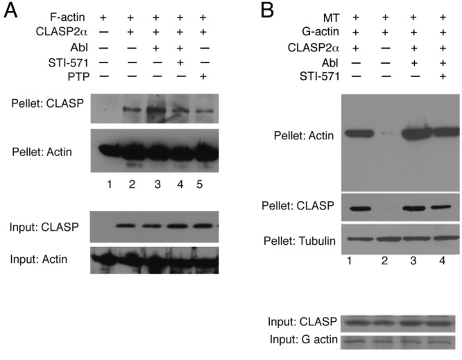 Fig. 6. Abl regulates CLASP2 binding to microfilaments. A: F-actin filaments were incubated with purified CLASP-myc-His with or without Abl and other reagents as indicated above lanes. After centrifugation, equal amounts of pellet (top panel) and the input (lower panel) were analyzed for each treatment with antibodies to actin, anti-myc for detection of CLASP2α-myc-His, and anti-tubulin. B: Purified CLASP2α-myc-His was incubated with taxol-stabilized MT bundles (see Materials and Methods) for 30 min with the components indicated above lanes. Monomeric (G) actin was added to the reaction instead of filamentous (F) actin. The mixture was centrifuged and the pellet was collected and analyzed by Western blot using antibodies directed against actin, tubulin, and myc (to detect CLASP2α). G-actin pellets with MTs in the presence of CLASP2α (Lane 1), but not in the absence of CLASP2 (Lane 2). Abl enhances the association of G-actin with MTs (Lane 3) and this association is abolished with STI-571 (Lane 4). Bottom panels show the input (1/10 of the total reaction volume) of both CLASP and G-actin. |