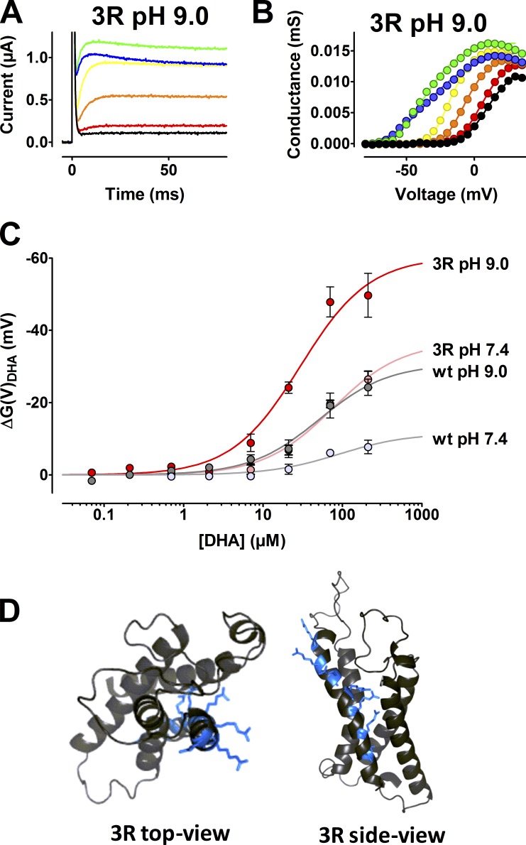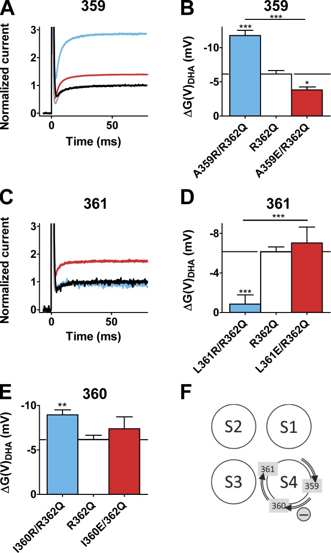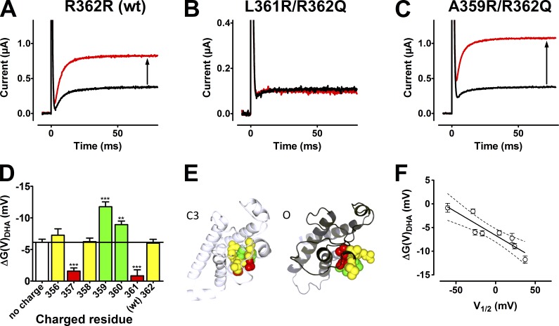 Polyunsaturated fatty acids modulate the voltage dependence of several voltage-gated ion channels, thereby being potent modifiers of cellular excitability. Detailed knowledge of this molecular mechanism can be used in designing a new class of small-molecule compounds against hyperexcitability diseases. Here, we show that arginines on one side of the helical K-channel voltage sensor S4 increased the sensitivity to docosahexaenoic acid (DHA), whereas arginines on the opposing side decreased this sensitivity. Glutamates had opposite effects. In addition, a positively charged DHA-like molecule, arachidonyl amine, had opposite effects to the negatively charged DHA. This suggests that S4 rotates to open the channel and that DHA electrostatically affects this rotation. A channel with arginines in positions 356, 359, and 362 was extremely sensitive to DHA: 70 µM DHA at pH 9.0 increased the current >500 times at negative voltages compared with wild type (WT). The small-molecule compound pimaric acid, a novel Shaker channel opener, opened the WT channel. The 356R/359R/362R channel drastically increased this effect, suggesting it to be instrumental in future drug screening.