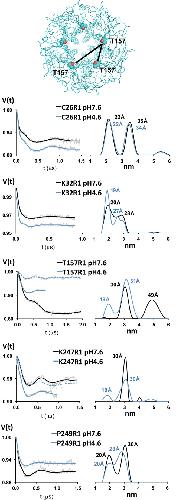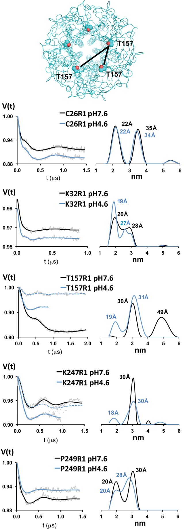 Figure 6. Proton-induced distance changes revealed by DEER spectroscopy.(Top panel) Top-down view of GLIC crystal structure shown in ribbon representation with T157 in spacefill, black lines depict distances between adjacent and nonadjacent residues. (Left panels) Background subtracted Q-band DEER-refocused echo intensity (grey lines) is plotted versus evolution time for each spin-labeled position at pH 7.6 (resting state) and pH 4.6 (desensitized state) and fit using model-free Tikhonov regularization (pH 7.6, black lines; pH 4.6, blue lines). Pairs of data were recorded on the same spectrometers and under identical conditions. (Right panels) The corresponding interspin distance distributions are plotted at pH 7.6 (black) and pH 4.6 (blue) with the mean distances for each peak labeled. For T157R1 and K247R1 samples at pH 4.6, we also collected data out to the same dipolar evolution times as the pH 7.6 samples (dotted blue lines).