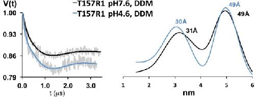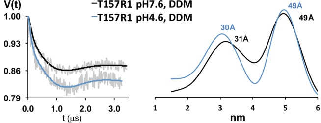 Figure 7. Detergent prevents proton-induced GLIC gating motions.(Right panel) Interspin distance distributions from model-free Tikhonov fits of X-band DEER data from GLIC T157R1 purified in detergent (DDM) micelles at pH 7.6 (black) and pH 4.6 (blue). (Left panel) The background-corrected dipolar evolution data at pH 7.6 and pH 4.6 (grey lines) and the Tikhonov fits (pH 7.6, black lines; pH 4.6, blue lines). The interspin DEER-derived distances are similar at both pH values, indicating that detergent-solubilized GLIC does not undergo proton-mediated gating motions.