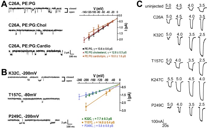 Figure 2. Purified GLIC reconstituted into liposomes is functional.(A) Single-channel currents of purified GLIC C26A mutant protein reconstituted into PE∶PG, PE∶PG∶cholesterol, and PE∶PG∶cardiolipin liposomes were recorded in planar lipid bilayers composed of the same lipids. Representative single-channel current traces (left), and current-voltage relationships with single-channel conductance values (right) are shown. Open-dwell times τo for the GLIC C26A mutant were 11.83±0.06 ms when reconstituted into PE∶PG liposomes, 10.15±0.08 ms into PE∶PG∶cholesterol liposomes, and 19.64±0.06 ms into PE∶PG∶cardiolipin liposomes, respectively. (B) Single-channel currents of purified GLIC mutants (K32C, T157C, and P249C) reconstituted into PE∶PG liposomes were recorded in planar lipid bilayers composed of the same lipids. Representative single-channel current traces (left) and current-voltage relationships with single-channel conductance values (right) are shown. (C) Currents induced by pH jumps from uninjected Xenopus laevis oocytes and ooctyes injected with purified, single cysteine MTSL-labeled GLIC protein reconstituted into PE∶PG liposomes (C26A, K32C, T157C, K247C, and P249C). Currents from GLIC-protein injected oocytes were significantly larger than those from uninjected oocytes.