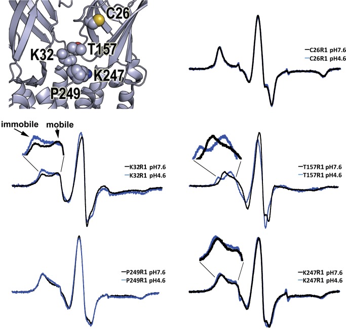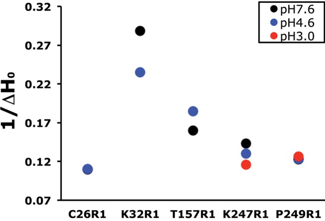 Figure 4. Proton-induced changes in spin probe mobility, ΔH0−1.For each GLIC mutant (C26R1, K32R1, T157R1, K247R1, and P249R1), the inverse width of the central line of the CW spectra, ΔH0−1, is plotted at pH 7.6 (black), pH 4.6 (blue), and pH 3.0 (red, K247R1 and P249R1 only). An increase in ΔH0−1 reflects increased R1 mobility, whereas a decrease reflects decreased mobility.