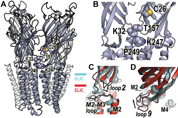 Figure 1. Location of loop 2, loop 9, and M2–M3 loop in GLIC.(A) Crystal structure of GLIC (PDB entry 3EHZ) with residues C26, K32, T157, K247, and P249 shown in space-fill. The fifth subunit on the backside was removed for clarity. (B) Close-up view of an intersubunit interface highlighting the region between the extracellular and transmembrane domains and the sites spin-labeled (space-fill). (C) Positions of loop 2 and M2–M3 loop in GLIC (3EHZ, cyan) and ELIC (2VL0, red) in aligned structures. Relative to ELIC, GLIC loop 2 is shifted inward towards the channel pore-lining M2 helix (labeled), whereas GLIC M2–M3 loop is shifted outward (arrows). (D) Positions of loop 9 in GLIC (cyan) and ELIC (red) in aligned structures. Relative to ELIC, GLIC loop 9 is shifted inward toward the M2 helix (arrow).