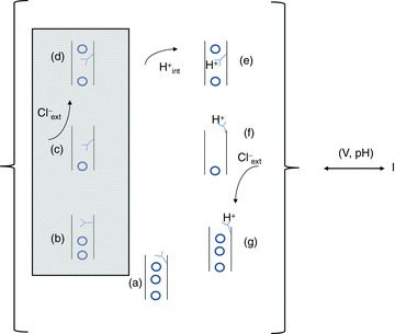 Figure 10. Schematic model of the transport cycle of ClC-5 including a gating mechanismThe hypothetical model is based on the transport cycle suggested for ClC-Cm by Feng et al. (2010) with the addition of state (c). The model is not intended to provide a realistic description of the ClC-5 transport cycle, but rather to guide a mechanistic interpretation of the results. Circles represent Cl− ions; the shaded box represents the branch of the transport cycle that is accessible to the E268A mutant. From any of the states composing the transport cycle, indicated collectively by a brace, ClC-5 can transition to the inactive state I in which it is not able to transport. Forward and backward transitions to state I are voltage and pH dependent. In state (a), the side chain of E211 is unprotonated and the transporter has all the binding sites occupied by Cl− ions. In state (b), the side chain of E211 moves to occupy Sext and one Cl− ion moves intracellularly. In state (c), the side chain of E211 moves to occupy Scen and this is associated with the transport of another Cl− ion, whereas Sext is transiently empty but binds an extracellular Cl− ion in state (d). From this conformation E211 can be protonated by an intracellular proton (state e) and can move outwardly (state f), giving way to Cl− binding from the extracellular space (state g). |