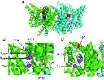 Figure 1. Location of the residue D76 mapped on the structure of ClC-ec1 (PDB entry: 1OTS)A, dimeric structure of ClC-ec1 viewed from the membrane plane (extracellular side above and cytoplasmic side below). The two subunits are shown in green and cyan. Residue E148 (corresponding to E211 in ClC-5) is coloured in blue, D54 (corresponding to D76 of ClC-5) is shown in red and E203 (corresponding to E268 of ClC-5) in orange. Cl− anions bound to Scen and Sint are shown in magenta. B, expanded representation of the anion permeation pathway for one of the subunits. The position of the three binding sites, Sext, Scen and Sint, is also indicated by horizontal dashed lines. C, same representation as in B with a top view perpendicular to the membrane. In B and C, some transmembrane helices were removed for clarity. |