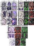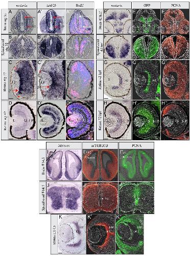 Fig. 2. Maturin expression during neural differentiation. Expression of maturin (A–K), differentiation (A′–K′) and proliferation markers (A″–K″) in frog (A–D″), zebrafish (E–H″) and mouse (I–K″) neural tissues. Expression of maturin (A–K) and tubb2b (A′–D′) was determined using in situ hybridization. Differentiating neurons were identified by GFP immunolabeling to detect elav3l:GFP transgene expression in zebrafish (green in E′–H′) and by acTUBB3b (orange in I′–K′) immunolabeling in mouse. Proliferating neuroblasts were identified by either BrdU in Xenopus (pink in A″–D″) or PCNA immunolabeling in zebrafish and mouse (orange in E″– H″ and green in I″– K″). Nuclei were stained blue with DAPI (A″–D″). Inset in panel D is magnified view of region encompassing the dorsal CMZ. MZ, marginal zone; VZ, ventricular zone; LP, lens placode; gc, ganglion cells; *, retinal periphery; L, lens; G, ganglion cell layer; I, inner plexiform layer; P, photoreceptor layer; NE, neuroepithelium; CP, cortical plate; IZ, intermediate zone; DCL, differentiated cell layer; NBL, neuroblastic layer. Scale bars, 50 μm. |