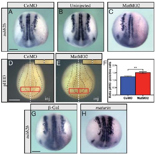Fig. 5. Maturin knockdown inhibits differentiation of neural progenitors. (A–C) Whole mount in situ hybridization for tubb2b following Maturin knockdown. tubb2b expression in CoMO injected (A), uninjected (B), or MatMO2 injected embryos (C). A similar effect on tubb2b expression was also observed with MatMO1 (Fig. S1G). (D–F) Proliferation in Morpholinoinjected embryos. Proliferating cells were labeled using pHH3 whole mount immunostaining in CoMO (D) and MatMO2 injected embryos (E). Insets in D and E show the 0.138 mm2 area on the control and injected side of each embryo in which pHH3-positive cells were counted to generate the results (F). (G–I) Whole mount in situ hybridization for tubb2b after maturin overexpression. tubb2b expression in β-Gal (G) and maturin cRNA (H) injected embryos. In all panels of this figure, the injected side is to the right (viewer’s perspective). The s.e.m. is shown. P-values obtained using Student’s t-test: **P=0.0023. Scale bars, 400μm. |