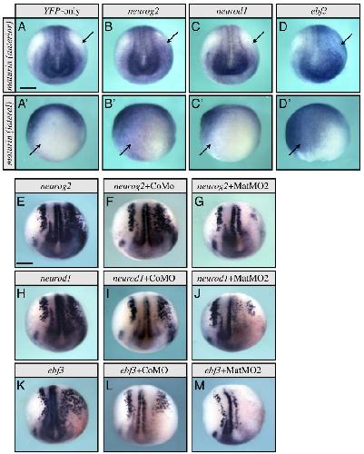 Fig. 6. Maturin transcription is induced by, and Maturin function is required for the activity of, the proneural transcription factors. (A–D′) Anterior (A–D) and lateral (A′–D′) views of maturin expression in embryos misexpressing YFP-only (A, A′), neurog2 (B, B′), neurod1 (C, C′), and ebf3 (D, D′), respectively. Arrows show areas normally lacking maturin (A, A′), express ectopic maturin when proneural transcription factors are misexpressed (B–D′). (E–M) One blastomere of 2-cell staged embryos were injected with the indicated proneural transcription factor alone (E, H and K), with control (F, I and L) or Maturin (G, J and M) morpholinos. The effects on tubb2b expression were detected by whole mount in situ hybridization at stage 15. Right side (viewer’s perspective) is the injected side. Scale bar, 400μm. |