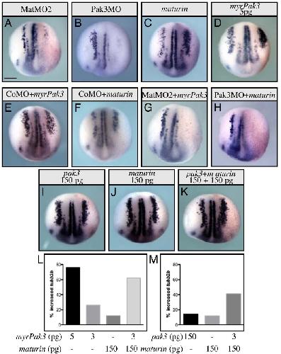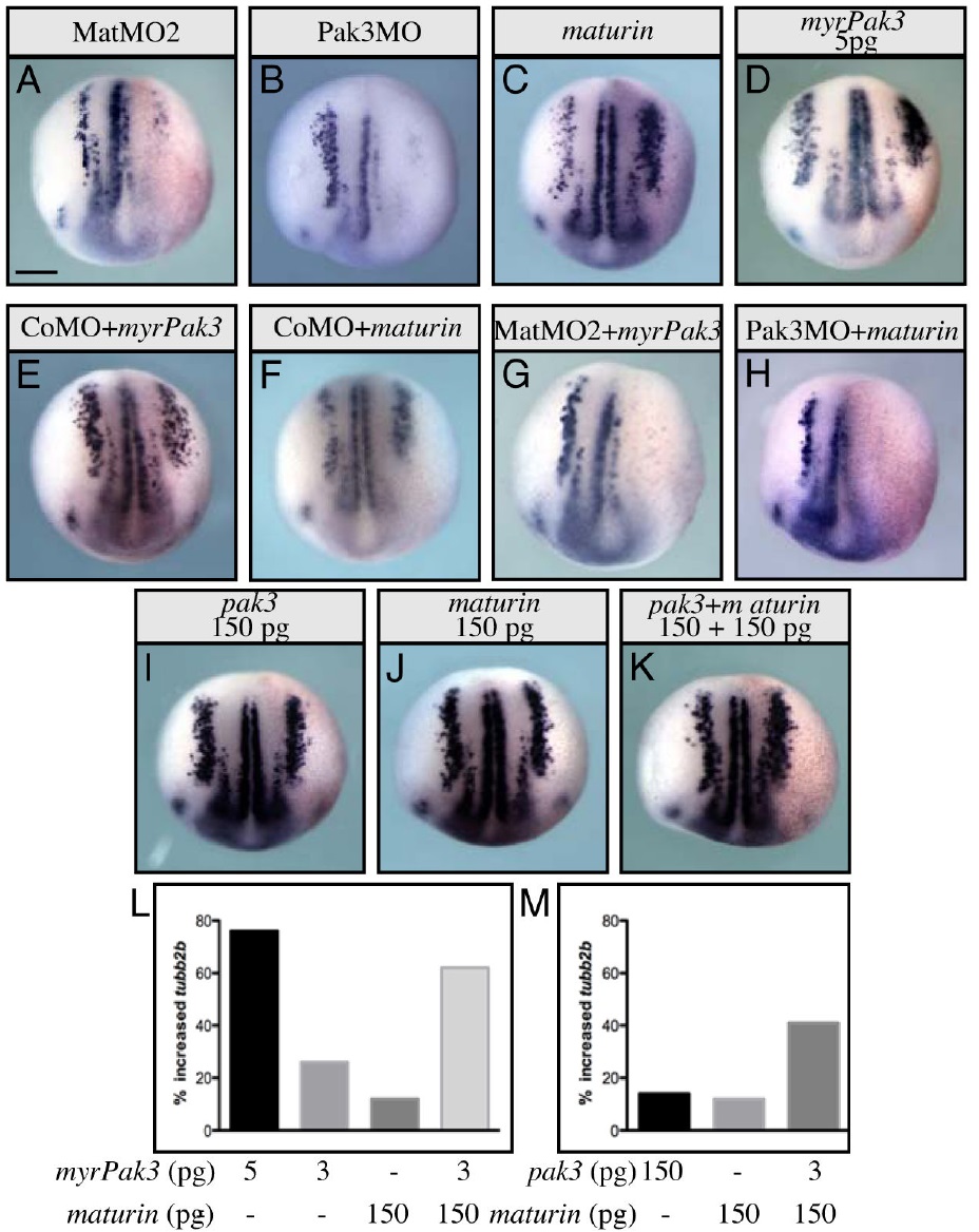 Fig. 7. Maturin and Pak3 synergy. (A–K) Embryos were injected unilaterally into one blastomere at the 2-cell stage with the indicated morpholino(s) and/or cRNA(s). At stage 15 in situ hybridization was used to determine the effect on tubb2b expression. (L, M) Graphs illustrate the percent of embryos with additional tubb2b-positive cells in the lateral stripe, when injected with sub-maximal amounts of maturin, myrPak3, pak3 or the indicated combination of cRNAs. Scale bars, 400μm. Injected side in all embryos is right side (viewer’s perspective). |