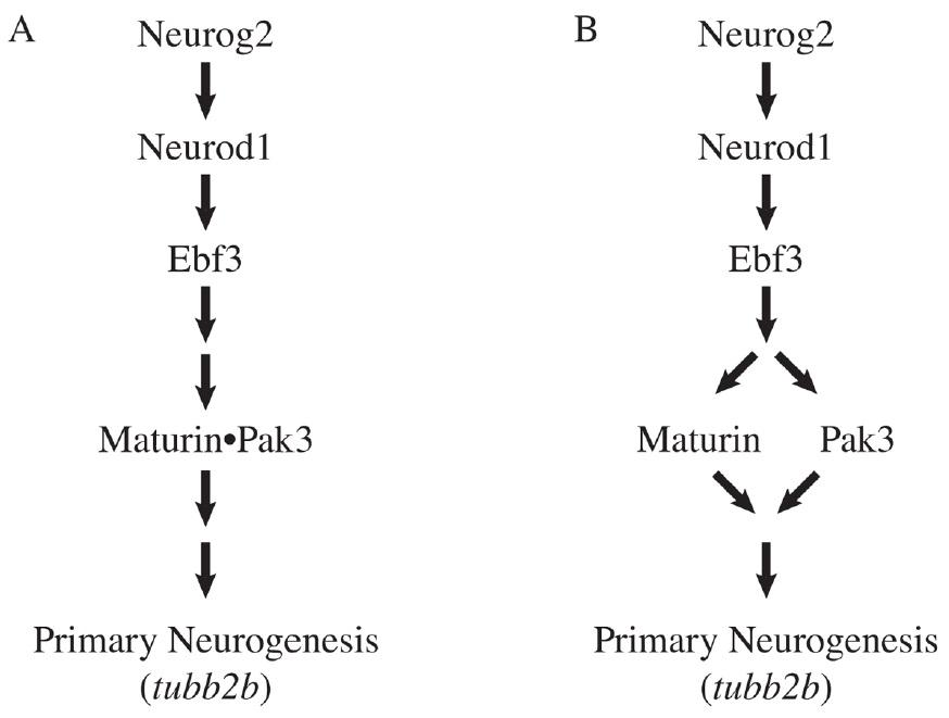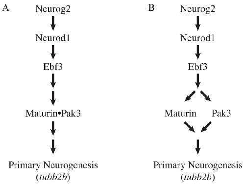 Fig. 8. Proposed gene network illustrating the most likely position of Maturin in the proneural pathway. Maturin and Pak3 function together downstream of the proneural transcription factors to promote differentiation of the primary neurons. Our results are consistent with models in which Maturin and Pak3 form a complex (A), or function independently (B). In both models, Maturin and Pak3 are both required for normal primary neurogenesis. |