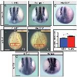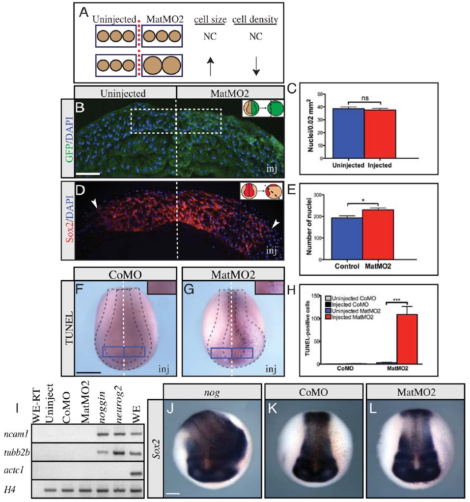 Fig. 4. Maturin knockdown increases neural cell number without reducing cell death or inducing neural cell fate. (A–C) Neural plate cell density in MatMO2-injected embryos. (A) Diagram illustrating the predicted effect on cell density if a change in cell size is responsible for neural plate expansion. (B) The number of nuclei (Blue - DAPI) in a 100 μm by 200 μm region on either side of the midline of embryos unilaterally injected with MatMO2 and GFP cRNA (green) was determined. Inset shows how the embryos were positioned for sectioning. (C) Average number of nuclei observed in 0.02 mm2 area. (D, E) Neural plate cell number in MatMO2-injected embryos. (D) Neural plate sections were stained for sox2 expression (red) and DAPI (blue). Dashed line indicates embryonic midline, and the lateral extent of sox2 expression is indicated by the arrowheads. Inset shows how the embryos were positioned for sectioning. (E) Total number of cells (nuclei) within the sox2 expression domain. (F–H) TUNEL staining was used to detect cell death in CoMO- (F) and MatMO2- injected embryos (G). Insets in F and G show the location of the 0.138 mm2 area on the control and injected side of each embryo scored to generate results (H). (I) RT-PCR for ncam1, tubb2b, actc1 (actin, alpha cardiac muscle 1) and H4 on animal cap explants from embryos injected into both blastomere at the 2-cell stage with CoMO, MatMO2, noggin or neurog2. Actc1 was used to confirm neural induction resulting from nog and neurog2 injection was direct (not via mesoderm induction) (Hemmati-Brivanlou and Melton, 1994). H4 was used as a loading control. Controls included RNA isolated from whole embryos and processed without (WE-RT) and with (WE) reverse transcriptase, as well as uninjected animal cap explants. Similar results were obtained from two independent experiments and when explants were cultured to the equivalent of stg 22. (J–L) Sox2 in situ hybridization on Martinez-De Luna et al. Page 21 embryos injected into one ventral blastomere at the 8-cell stage with noggin (J), CoMO (K) or MatMO2 (L). The injected side is on the right (viewer’s perspective). In the graphs the error bars show the s.e.m. P-values obtained using Student’s t-test: ns,not significant; *P=0.0101; ***P<0.0001. Scale bars, (B)=100 μm; (F and J)=400 μm. |