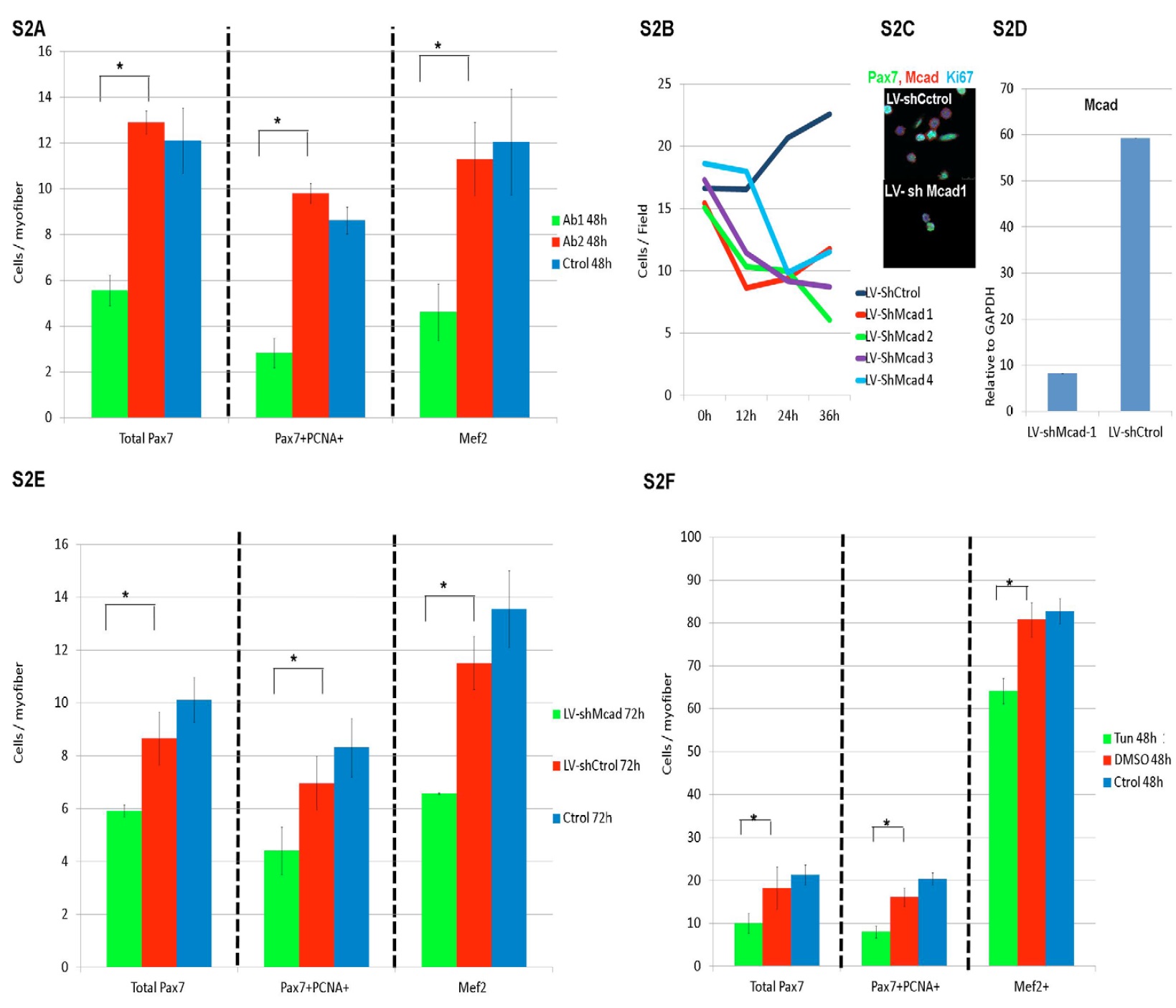 infected with the LVshCtrol. Analyses performed by means of RTq PCR (E) Pax7, PCNA, and Mef2, positive and negative cell count