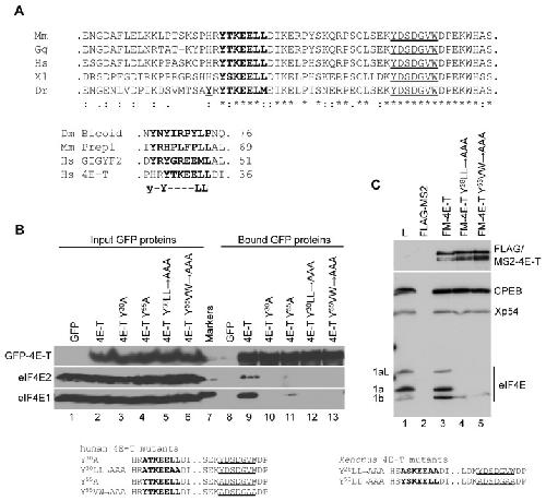 Figure 3. The eIF4E-binding site in 4E-T.A. Top. The sequences of the eIF4E2-binding site in Dm Bicoid [17], Mm Prep1 [18], Hs GIGYF2 [19] and Hs 4E-T ( [20]. Bottom. Alignments of five indicated vertebrate 4E-T sequences using ClustalW2. In bold are indicated the eIF4E-binding site residues, note the upstream tyrosine in Dr 4ET, bold and underlined. Underlined are the residues of a potential conserved second eIF4E-binding site. B. HEK293 cells were transfected with wild type or mutant GFP-4E-T as indicated and lysates were analysed by GFP-Trap and western blotting with eIF4E1, eIF4E2 and 4E-T antibodies. C. mRNAs encoding FLAG-MS2 and FLAG-MS2-X4E-T proteins were injected into Xenopus oocytes. After 16 hours, lysates were prepared and immunoprecipitated with FLAG antibodies, and the FLAG peptide eluates were analysed by western blotting with indicated antibodies. L lane indicates uninjected oocyte lysate. The mutations in human and Xenopus 4E-T sequences are indicated in B and C.