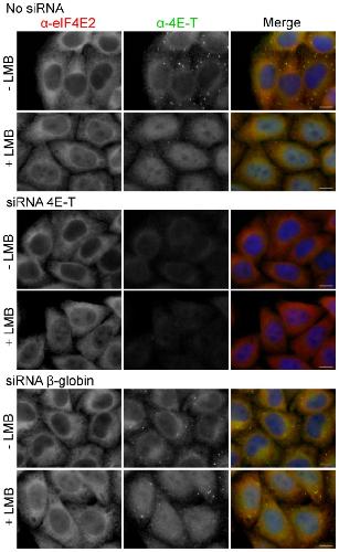Figure 7. eIF4E2 shuttling in the presence of LMB is 4E-T independent.Untransfected Hela cells (no siRNA), or cells transfected with 4E-T siRNA or control β-globin siRNA were treated with LMB and immunostained with eIF4E2 and 4E-T antibodies as indicated. Cells were also stained with DAPI. Scale bar, 10 µm.
