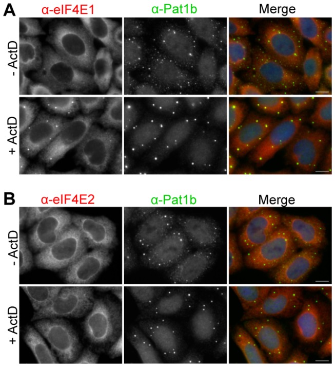 Figure 5. eIF4E1 and eIF4E2 distribution in Actinomycin D-treated cells.Control HeLa cells (- ActD) and cells treated with Actinomycin D (+ ActD) to inhibit RNA synthesis were immunostained with eIF4E1 (A) and eIF4E2 (B) antibodies, and counter-stained with Pat1b antibodies. Note that the apparent nuclear staining in the case of Pat1b antibody was previously shown to be insensitive to Pat1b siRNA [49]. Cells were also stained with DAPI. Scale bar, 10 µm.