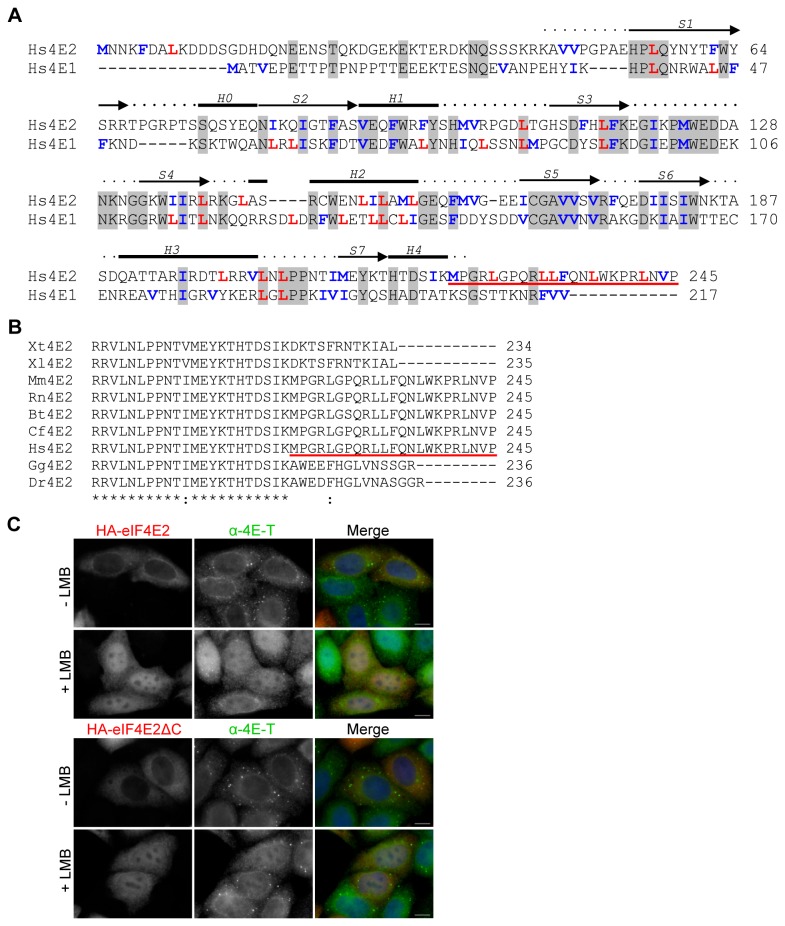 Figure 8. The leucine-rich C-terminus of eIF4E2 does not act as a NES.A. Sequence alignment of human eIF4E1 and eIF4E2 performed with ClustalW2. Secondary structural elements of α-helices (H0-H4) and β-strands (S1-S7) were shown above the alignment according to the crystal structure of human eIF4E2 in complex with m7 GTP (PDB id: 2JGB) [15]. Identities are shaded in grey. With blue and red are marked hydrophobic residues that typically form the NES. The leucine-rich C-terminus of eIF4E2 is underlined in red. B. ClustalW alignment of the C-terminal regions of indicated eIF4E2 proteins. C. HeLa cells transfected with HA-eIF4E2 full-length protein or HA-eIF4E2ΔC (truncated at residue 222) were treated with LMB or methanol (-) for 5 hrs and immunostained with HA and 4E-T antibodies as indicated. Cells were also stained with DAPI. Scale bar, 10 µm.