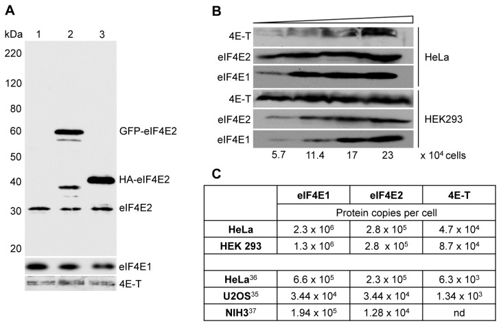 A. Verification of chicken eIF4EL3/eIF4E2 antibody using untransfected Hela cells (1), and cells overexpressing GFP-eIF4E2 (2) and HA-eIF4E2 (3). Top panel developed with eIF4E2 antibody, bottom panels with eIF4E1 and 4E-T antibodies. Molecular weight standards are indicated in kDa. B. Comparison of eIF4E1, eIF4E2 and 4E-T levels in HeLa and HEK293 cells analysed by western blotting with indicated antibodies. Increasing amounts of lysate from HeLa cells (20, 40 and 80 µg total protein) and HEK293 cells (10, 20 and 40 µg) approximating to 5.7, 11.4, 17 and 23 x 104 cells. C. Table comparing eIF4E1, eIF4E2 and 4E-T levels (protein copies/per cell) in HeLa and HEK293 determined by western blotting (top), to those reported in genome-wide mass spectrometry studies in HeLa [35], U20S [34] and NIH3T3 [36] cells.